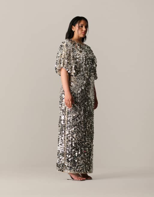 ARRANGE Curve sequin and fringe strong shoulder maxi dress in silver