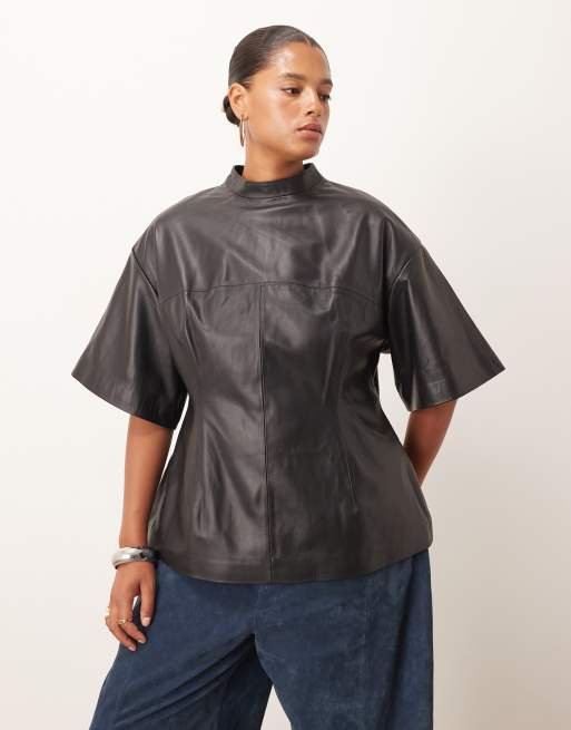 ARRANGE Curve soft leather high neck top with nipped in waist in black