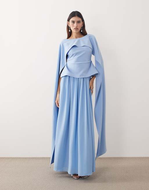 ARRANGE drape shoulder layered pleated maxi dress in pale blue