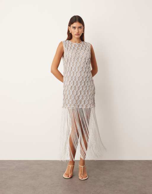 ARRANGE lattice grid mini dress with fringe hem in metallic