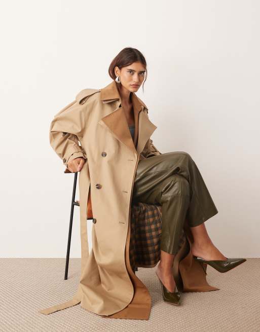 ARRANGE two tone lapel double breasted trench coat in tan