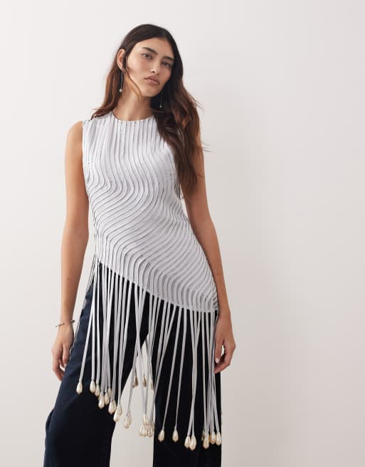 ARRANGE wave linear pearl droplet fringe hem top in soft blue