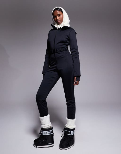 ASOS 4505 Ski soft shell belted ski suit with skinny leg and faux fur hood in black