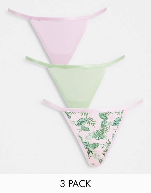 ASOS DESIGN 3 pack microfibre palm print thong in pink & green