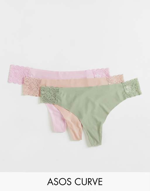ASOS DESIGN Curve 3 pack no VPL lace side thong pack in khaki, mink & beige