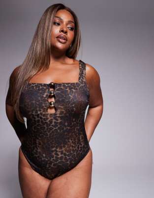 ASOS DESIGN Curve Adriana Revenge Swimsuit with gold ball trim in leopard print