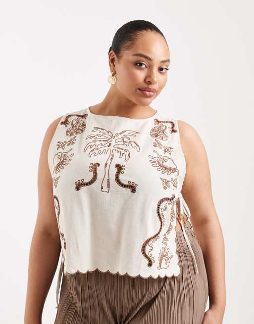 ASOS DESIGN Curve Angie Palm beach tropical embroidered tie side tank in stone