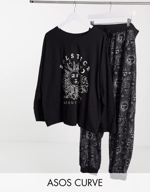 ASOS DESIGN Curve astrology drop armhole tee & cuffed jogger pyjama set in black