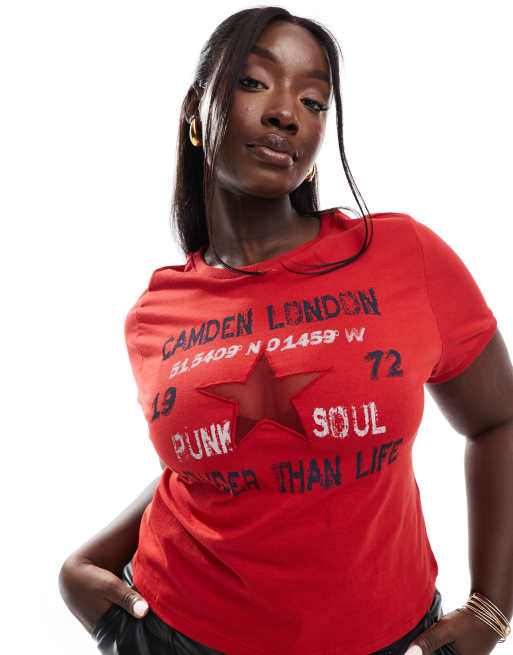 ASOS DESIGN Curve baby tee with indie mesh star cut out graphic in red