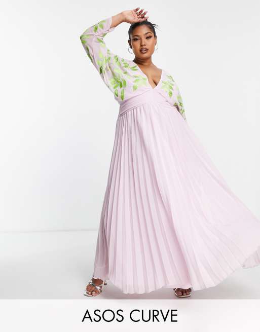 ASOS DESIGN Curve batwing pleated maxi dress in lilac with green embroidery
