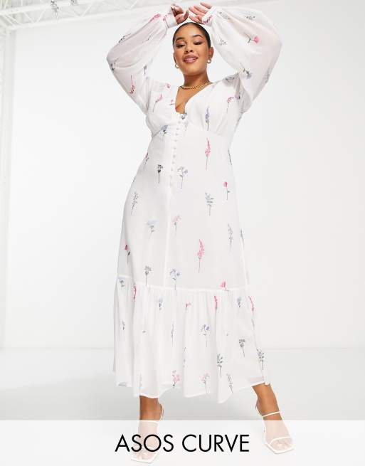 ASOS DESIGN Curve button through embroidered maxi tea dress in white