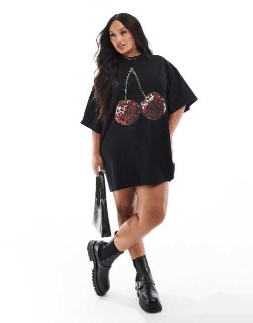 ASOS DESIGN Curve cherry leopard graphic oversized t-shirt mini dress in black