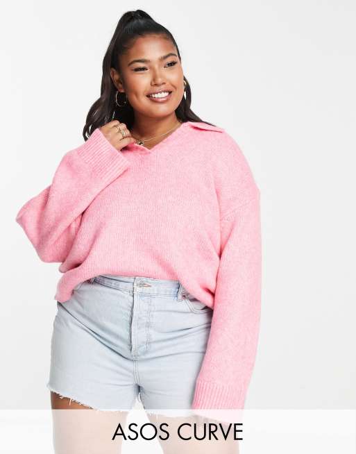 ASOS DESIGN Curve chunky jumper with open collar in pink
