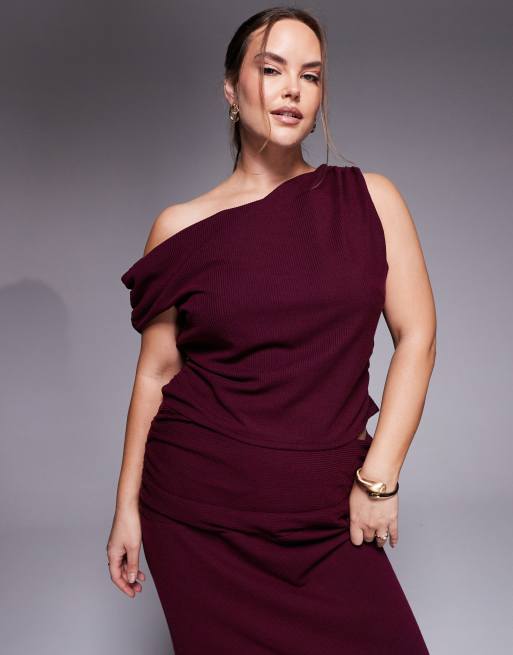 ASOS DESIGN Curve co-ord asymmetric textured rib top in burgundy