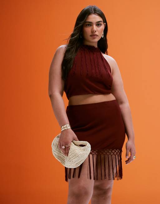 ASOS DESIGN Curve co-ord fringed halter neck top in rust