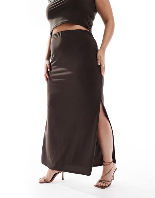 ASOS DESIGN Curve co-ord slinky midi skirt with side splits in chocolate