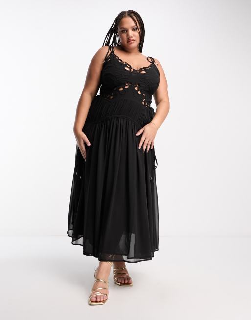 ASOS DESIGN Curve cutwork maxi slip dress with drawstring waist in black