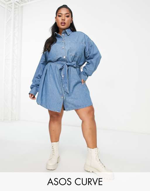ASOS DESIGN Curve denim belted shirt dress in midwash