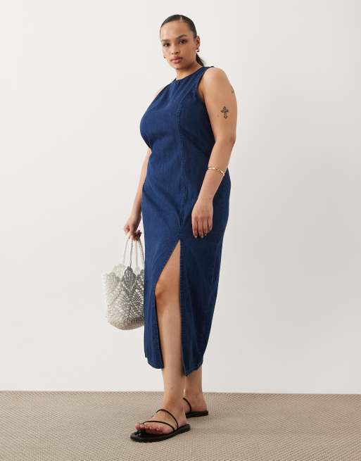 ASOS DESIGN Curve denim fitted midi dress in rich mid blue