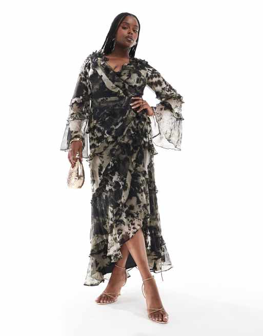 ASOS DESIGN Curve exclusive ruffle high-low hem midi dress in mono abstract print