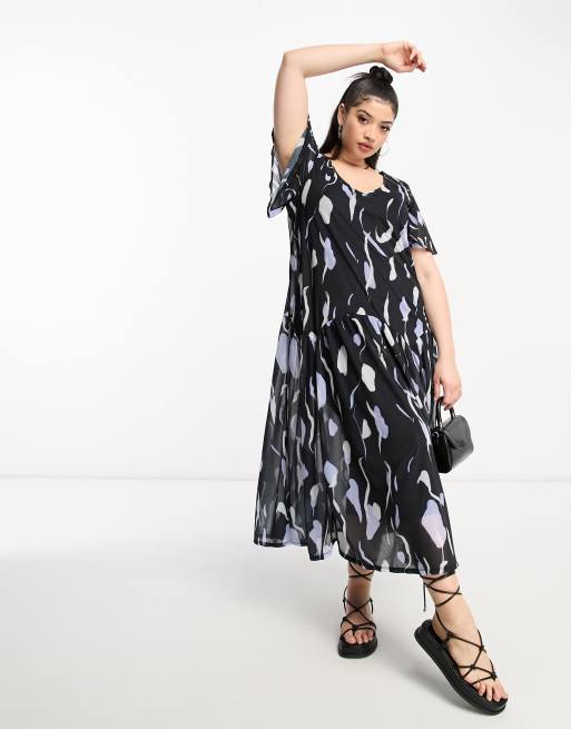 ASOS DESIGN Curve exclusive v neck chiffon smock midi dress in purple squiggle print