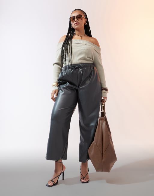 ASOS DESIGN Curve faux leather wide leg pull on trousers in charcoal