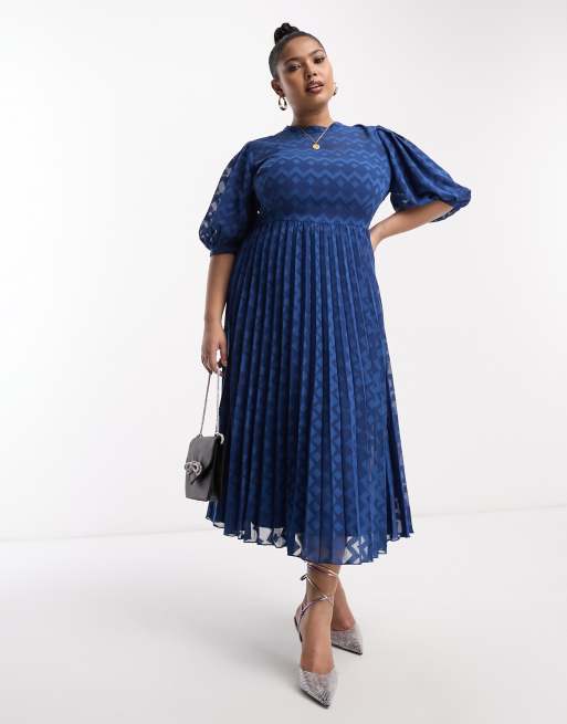 ASOS DESIGN Curve high neck pleated chevron dobby midi dress with puff sleeve in Navy