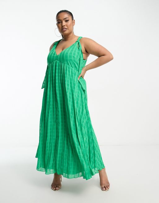 ASOS DESIGN Curve jacquard check plunge neck pleat midi dress with tie straps in emerald green