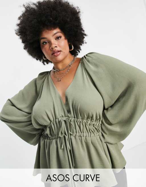 ASOS DESIGN Curve long sleeve v neck top with kimono sleeve and tie front in Khaki