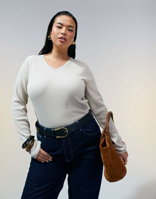 ASOS DESIGN Curve mini v neck long sleeve top in waffle in stone