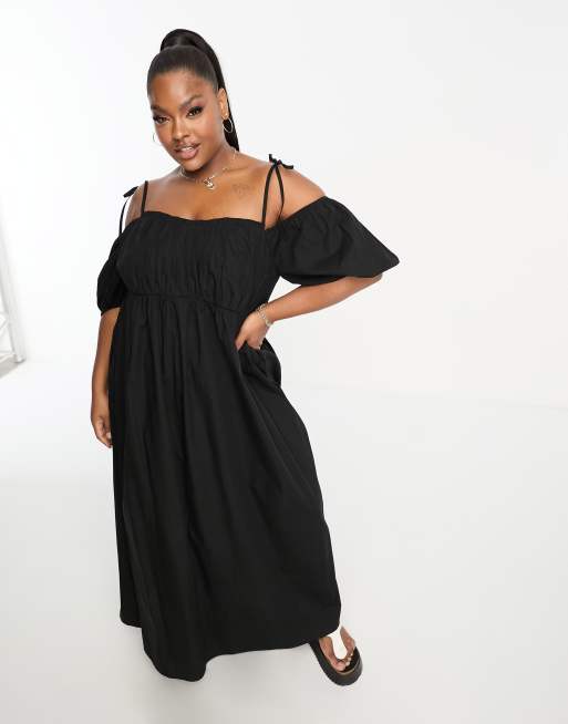 ASOS DESIGN Curve off shoulder cotton maxi dress with ruched bust detail in black