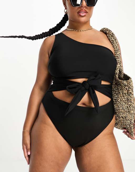 ASOS DESIGN Curve one shoulder cut out swimsuit in black