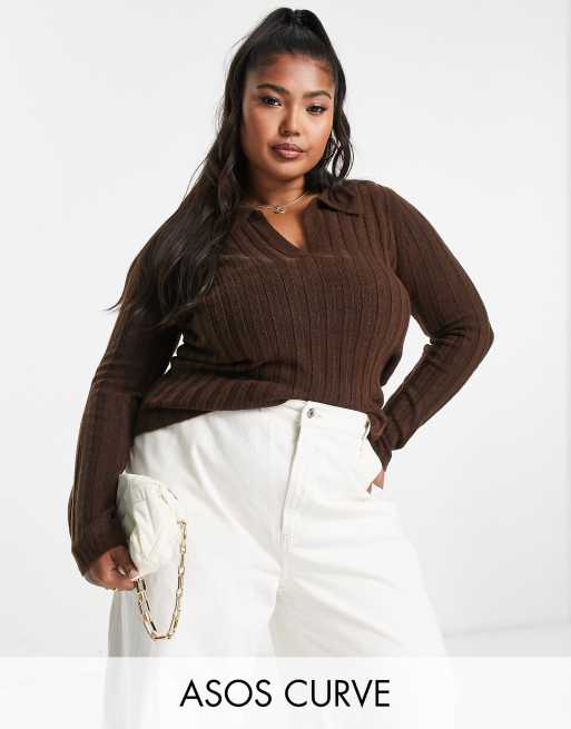 ASOS DESIGN Curve open collar rib jumper in brown