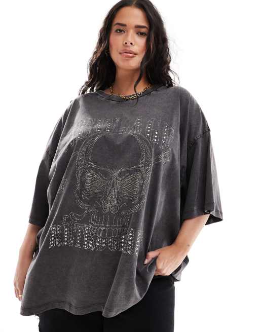 ASOS DESIGN Curve oversized t-shirt with hotfix skull rock graphic in washed charcoal