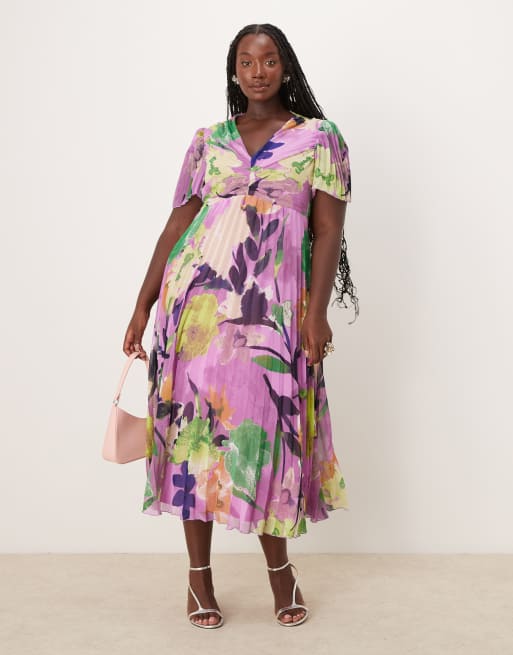 ASOS DESIGN Curve pleated bodice flutter sleeve pleat midi dress in print