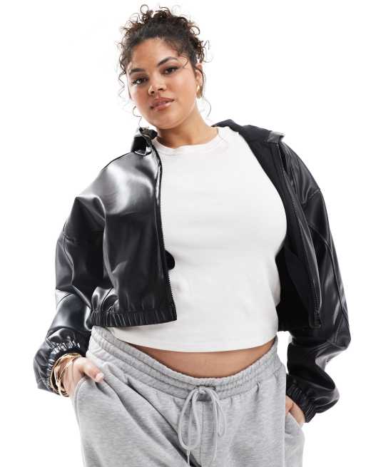 ASOS DESIGN Curve PU cropped zip through hoodie in black