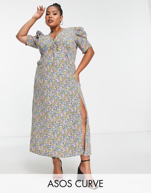 ASOS DESIGN Curve puff sleeve midi tea dress in multicoloured floral print