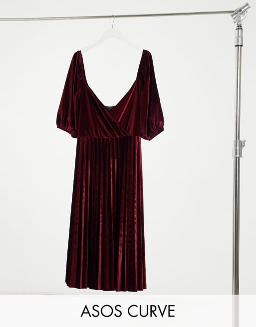 ASOS DESIGN Curve puff sleeve velvet wrap pleat midi dress in oxblood
