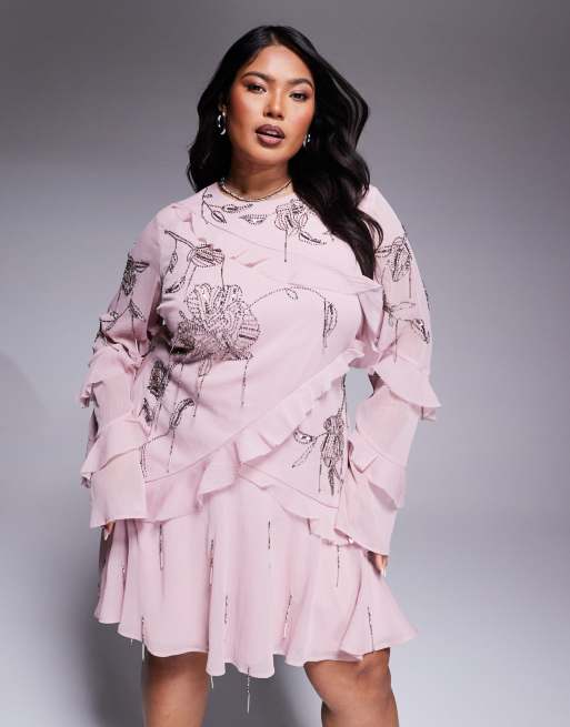 ASOS DESIGN Curve raw edge ruffle embellished mini dress with open back in dusky pink