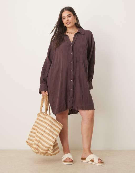 ASOS DESIGN Curve relaxed laundered shirt mini dress in washed chocolate