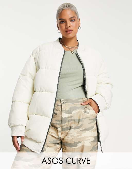 ASOS DESIGN Curve reversible quilted bomber jacket in khaki and cream