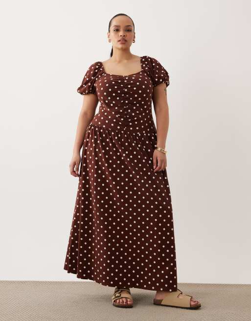 ASOS DESIGN Curve ruched front midi tea dress in chocolate polka dot
