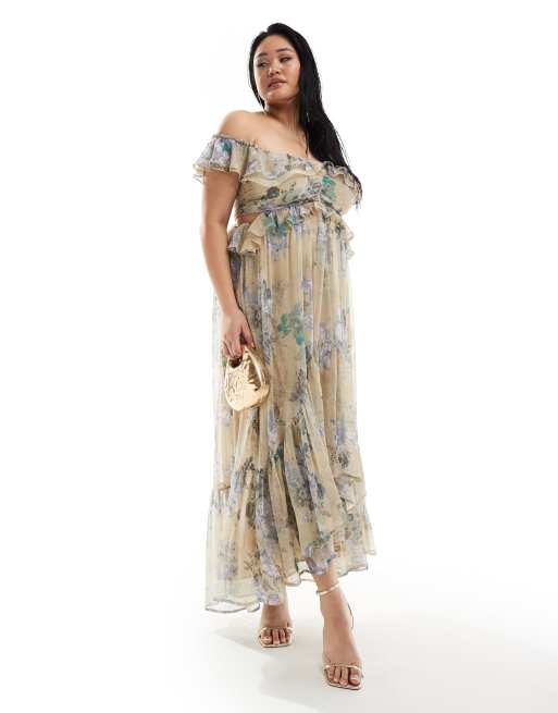 ASOS DESIGN Curve ruffle cut out off the shoulder maxi dress with hi low hem in green floral print