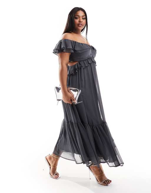 ASOS DESIGN Curve ruffle cut out off the shoulder midi dress in charcoal
