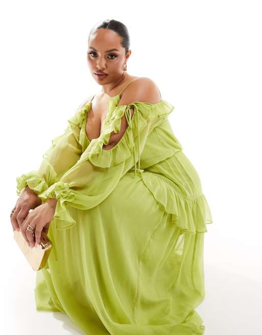 ASOS DESIGN Curve ruffle off shoulder midi dress in olive green