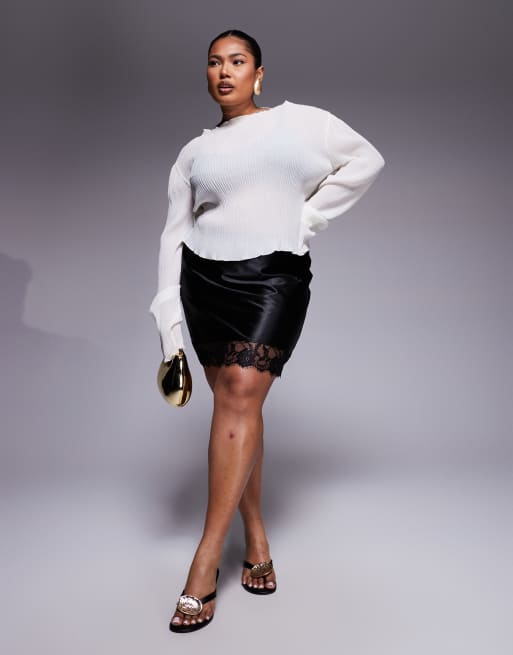 ASOS DESIGN Curve satin lace trim mini skirt in black