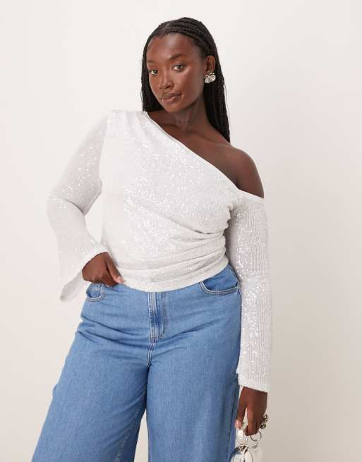 ASOS DESIGN Curve sequin ruched asymmetric neck top in white