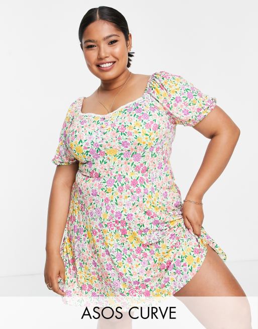 ASOS DESIGN Curve short sleeve mini tea dress with lace trim in bright floral