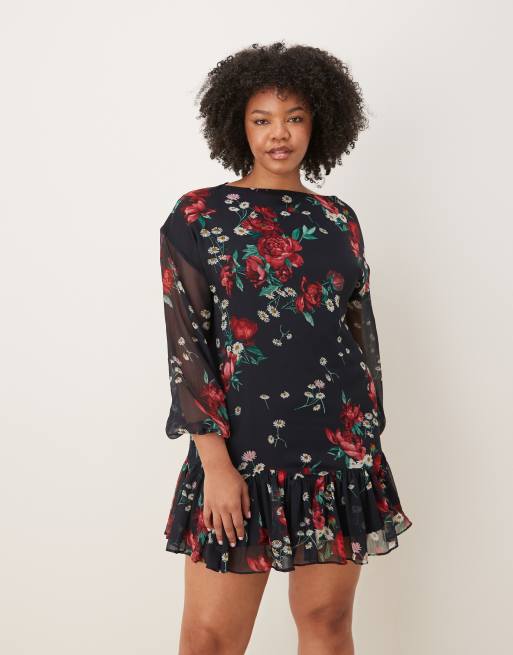 ASOS DESIGN Curve slash neck chiffon godet mini dress in black red floral