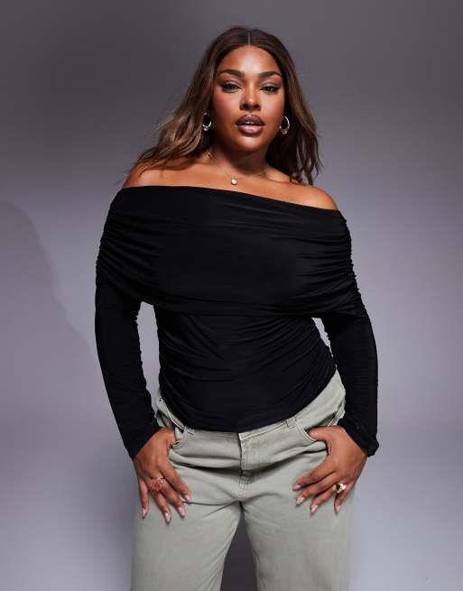 ASOS DESIGN Curve slinky drape bardot long sleeve top in black